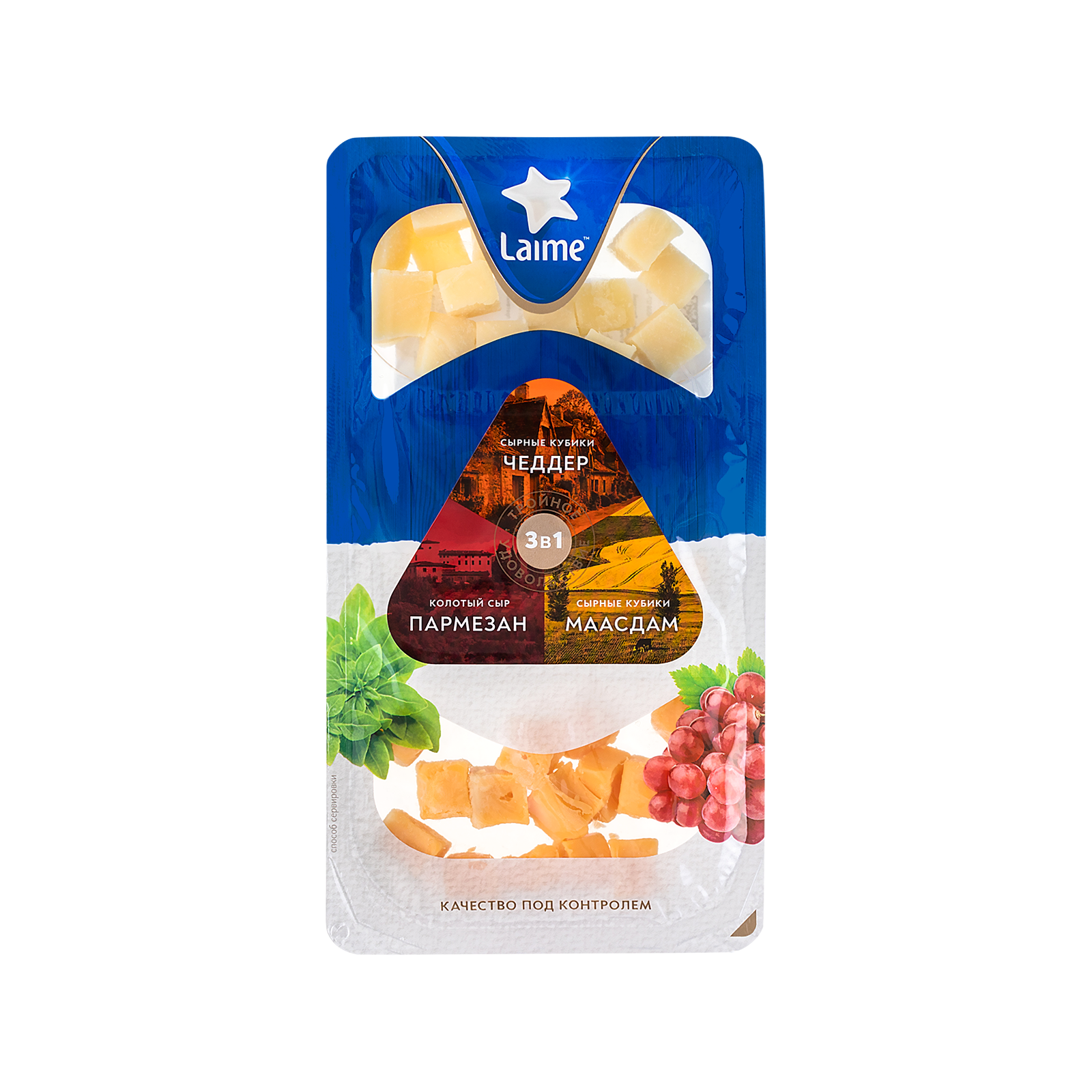 Ассорти сыров 'Пармезан', 'Маасдам' и 'Чеддер' ТЗ 'LAIME' 5шт*120гр (колка и кубики) (Россия, Спб)