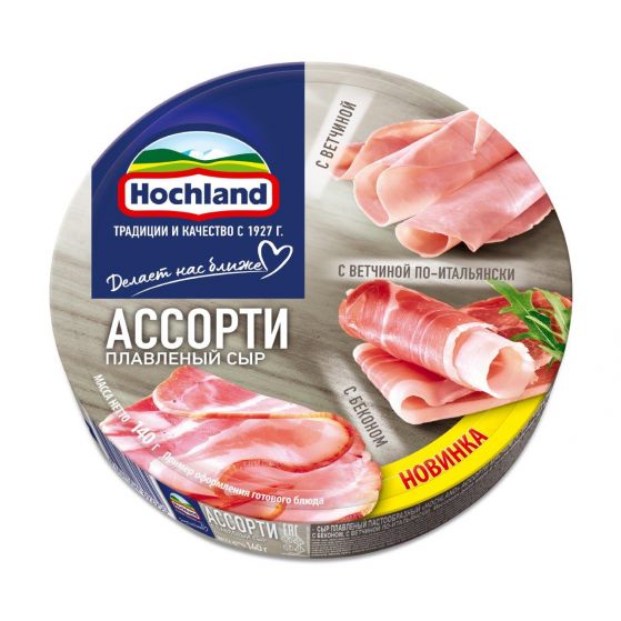 Сыр Hochland плавленый пастообразный Ассорти мясное (с ветчиной, с беконом, с ветчиной по-итальянски) м.д.ж. 50% 10шт*140гр в круглых коробочках (Россия)