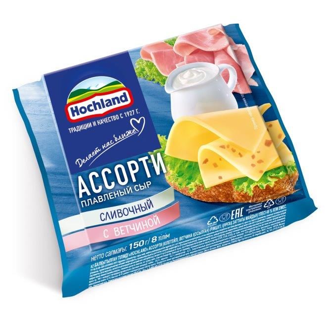 Сыр Hochland плавленый Ассорти (сливочный, ветчина) м.д.ж. 45% 9шт*150гр ломтики (Россия)