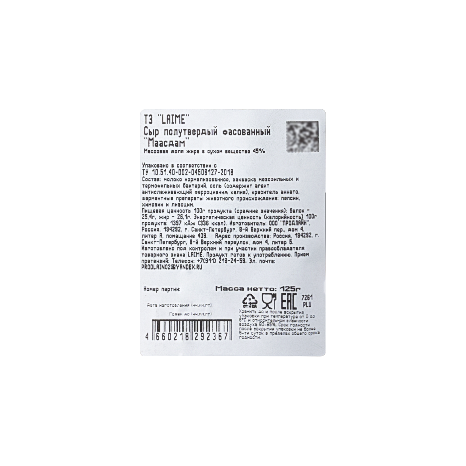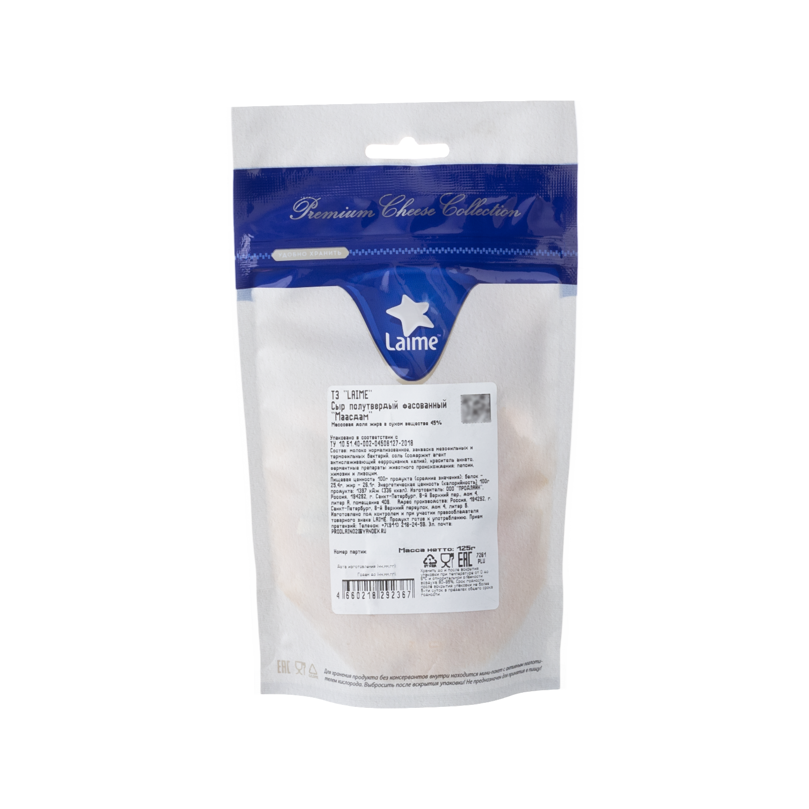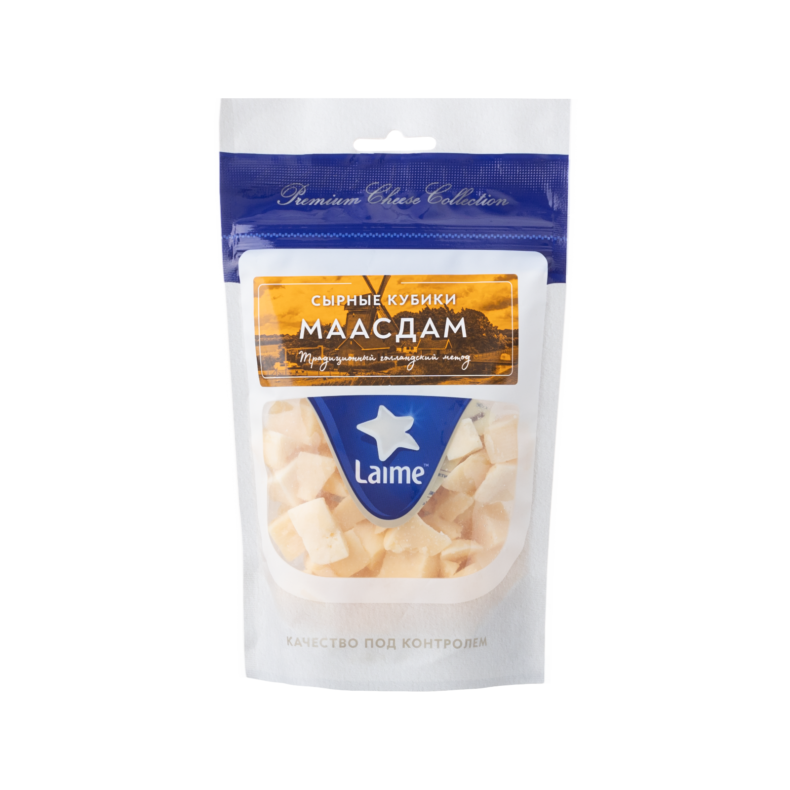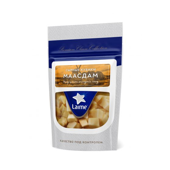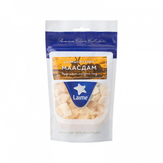 Сыр полутвердый фасованный 'Маасдам'м.д.ж. в с.в. 45% тз 'Laime' фас. 10шт*125г (кубики, дой пак)(Россия, Спб)