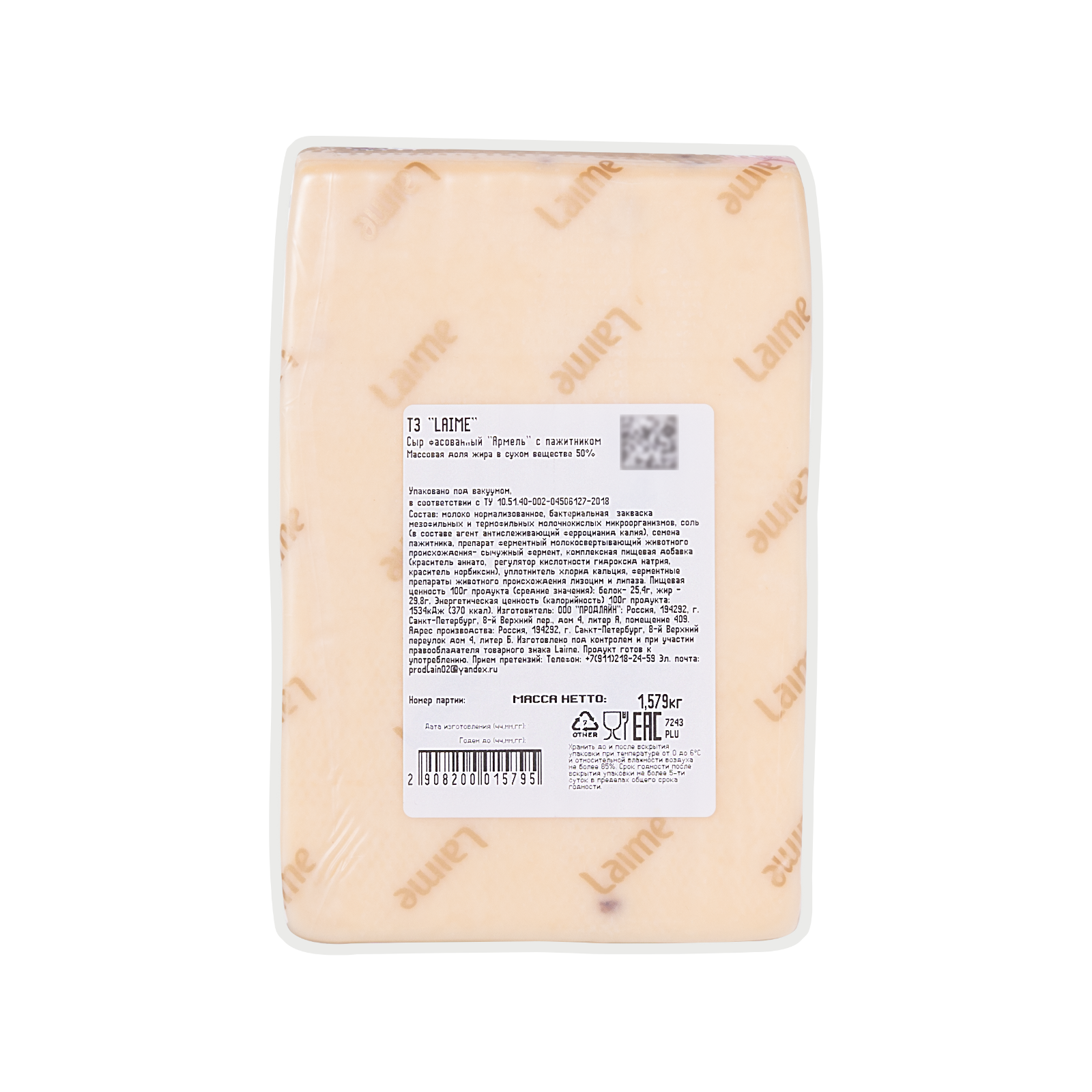 Сыр фасованный 'Армель' с пажитником ТЗ 'LAIME' м.д.ж. в с.в. 50% блок 4шт*~1,5 кг(Россия, Спб)