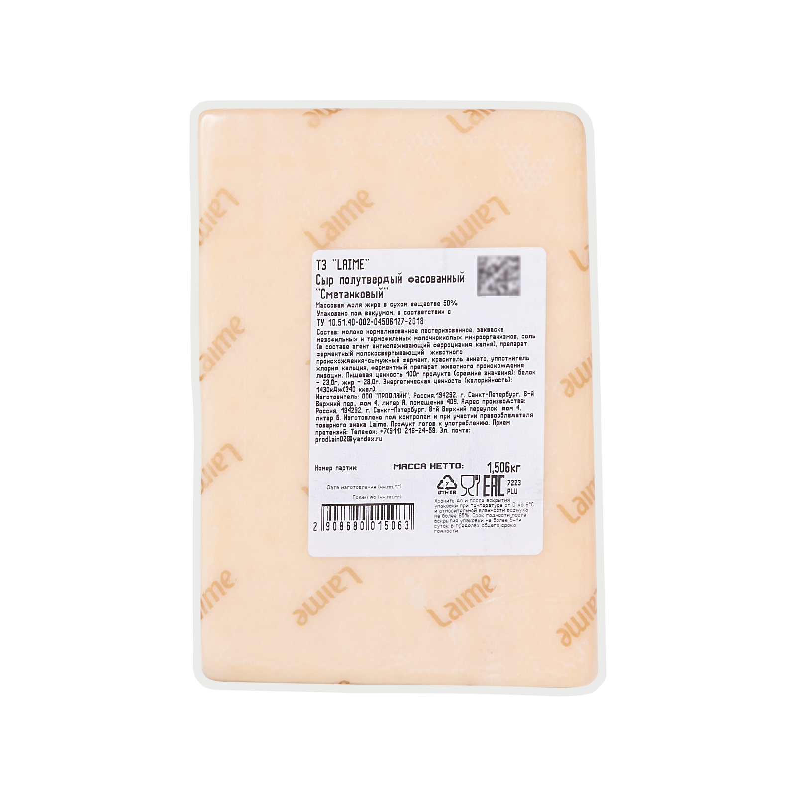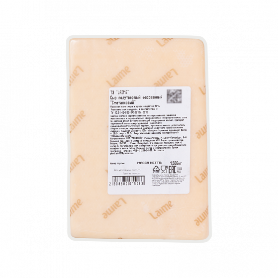 Сыр полутвердый фасованный 'Сметанковый' м.д.ж в с.в. 50% т.з «Laime» 4~*1,5 кг (Россия)