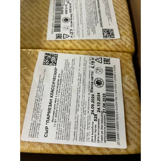 Сыр твердый 'Пармезан классический' м.д.ж. в с.в. 45% 4шт*~3,7кг брус (Беларусь)